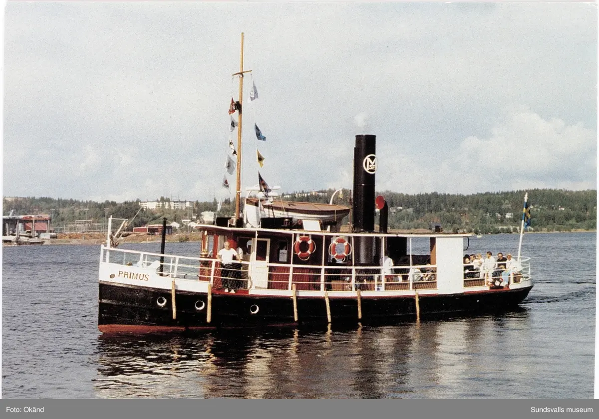 Bogserbåten Primus, byggd 1874 i J W Lindbergs verkstäder i Stockholm. Kom sedan till Mons sågverk. Från 1984 i Medelpads sjöhistoriska förenings ägo. Upprustad och nyinvigd 1994. Vykort (rastrerat).