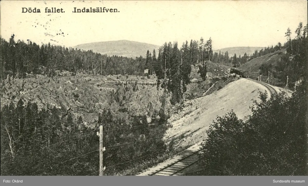 Vykort med motiv över Döda fallet och järnvägen strax bredvid.