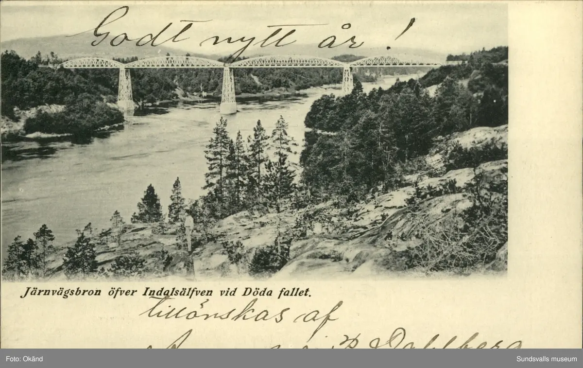 Vykort med motiv av järnvägsbron över Indalsälven vid Döda fallet