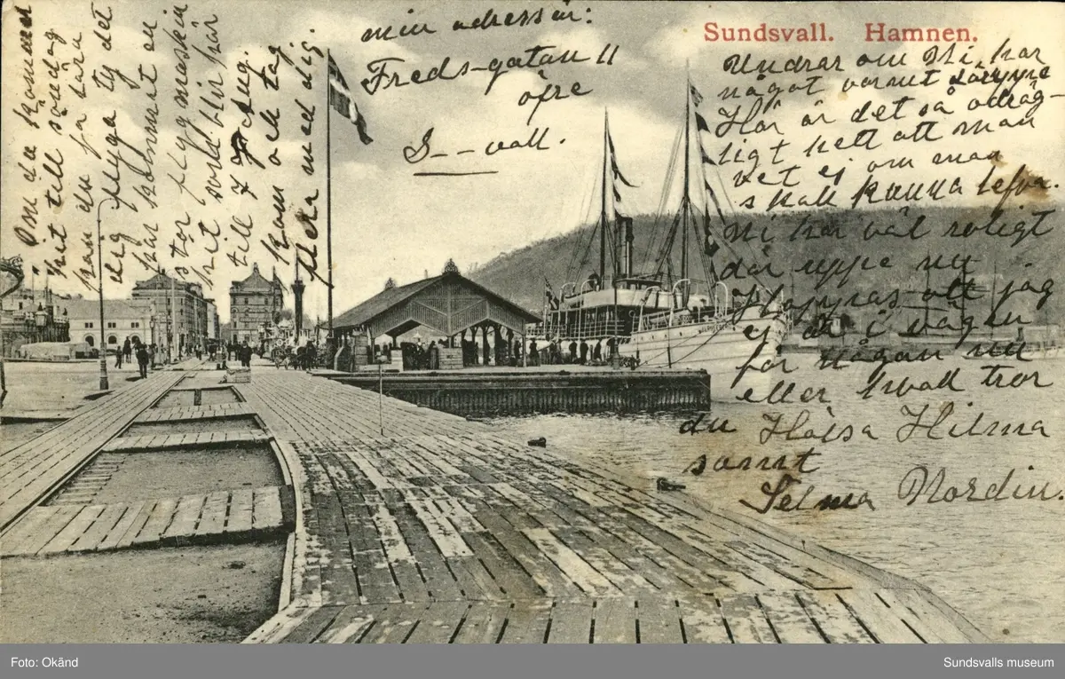 Vykort med motiv över hamnen och passagarerartrafiken i Sundsvall.