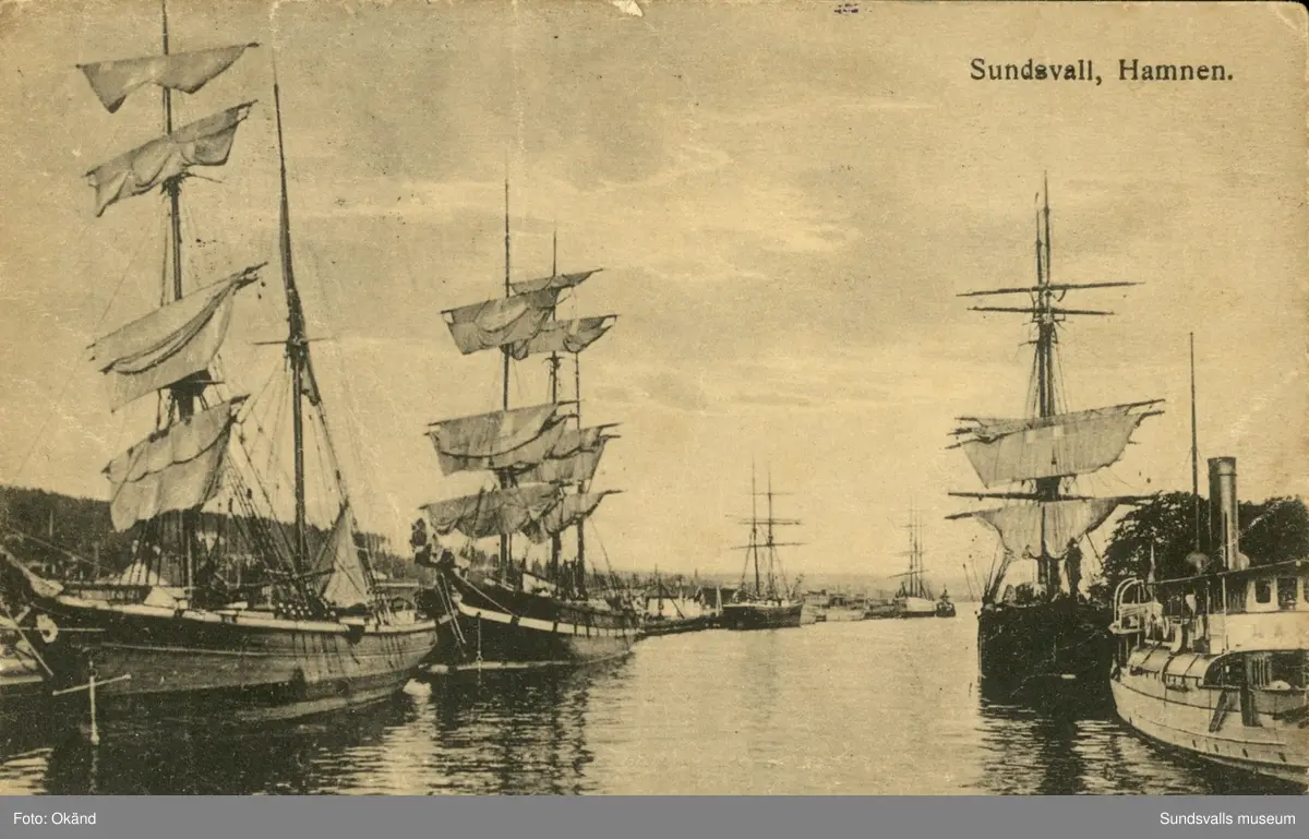 Vykort med motiv över fartygen vid hamnen i Sundsvall.