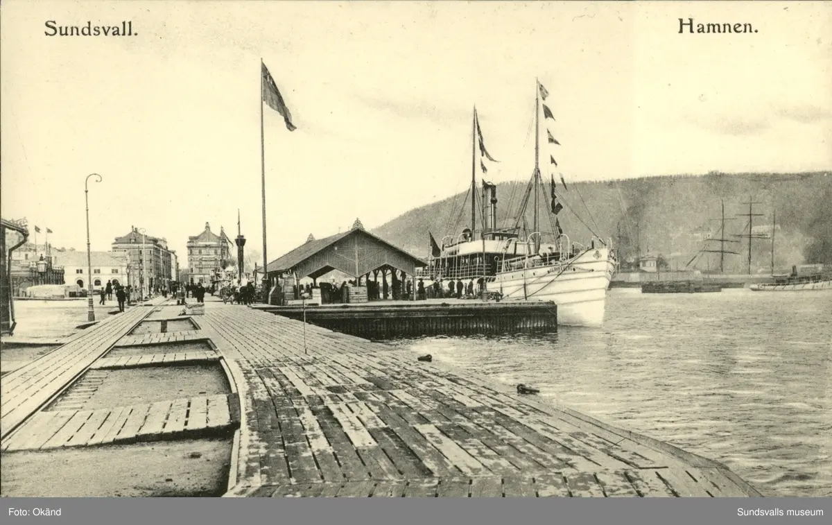 Titel: Vykort med motiv över hamnen i Sundsvall.