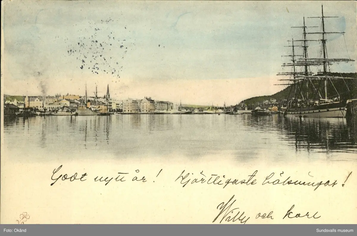 Vykort med motiv över hamnen i Sundsvall.