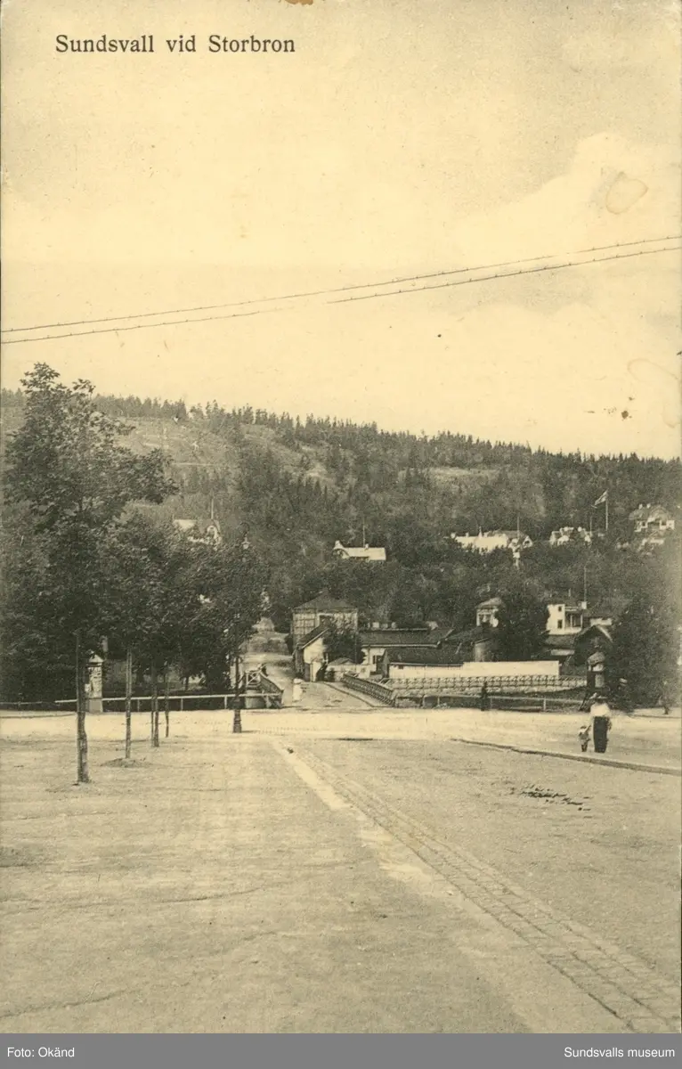 Vykort med motiv sett från Skolhusallén över Storbron i Sundsvall.