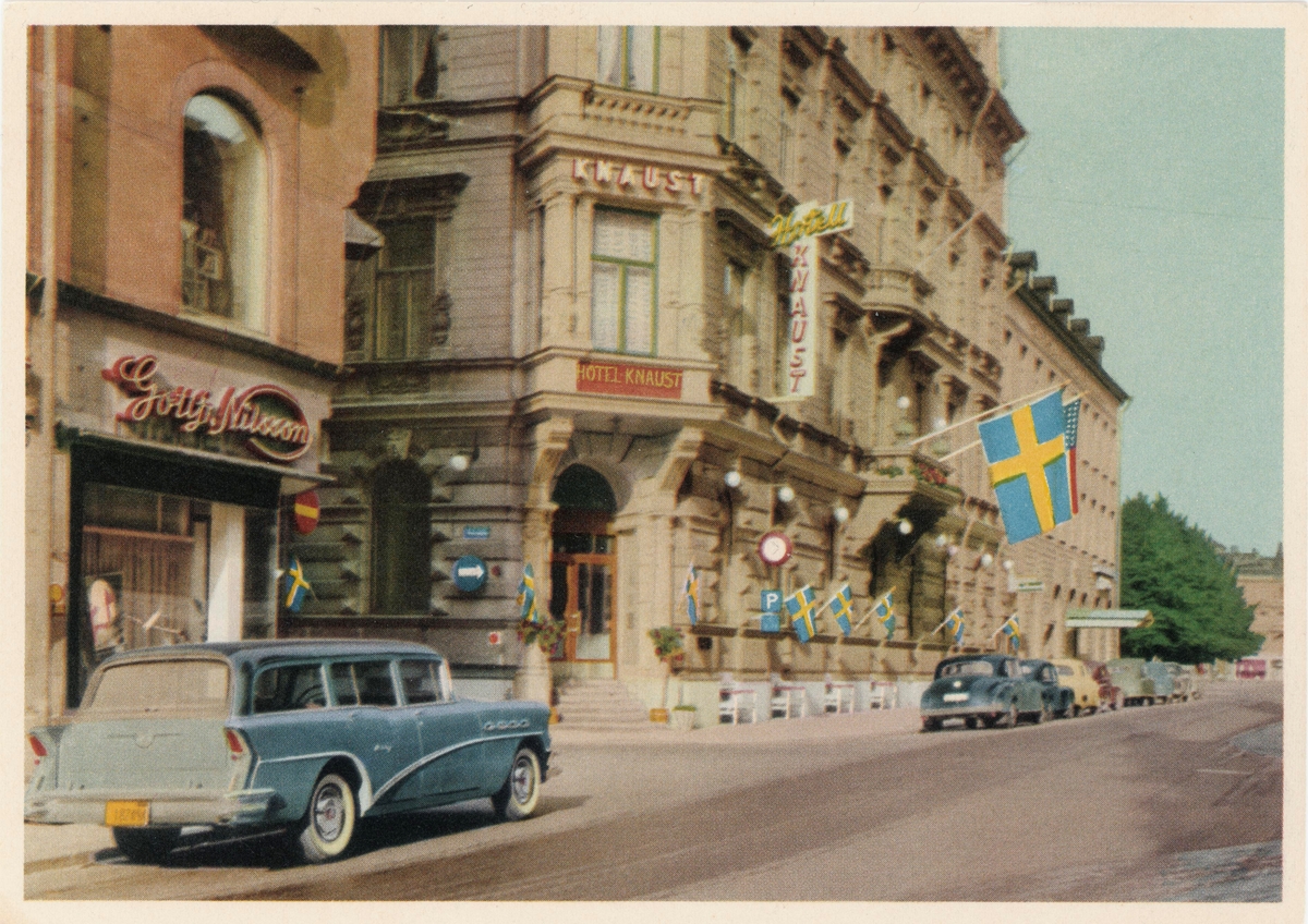 Storgatan. Från vänster Gottfrid Nilssons skoaffär. Mitt i bild Hotell Knaust prytt med en svensk och en amerikansk flagga. Rasterat vykort. Förlag: Norrlandstryckeriet AB, Sundsvall.