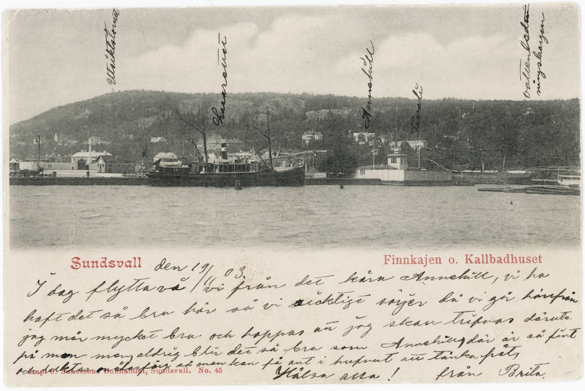 Finnkajen med ett passagerarfartyg. Till höger kallbadhuset. Ovanför badhuset ses Tivolirestaurangen. Handskrivna noteringar i överkanten "Utsiktstornet, Lasarettet, Annehill, Tivoli, Vattenledningsborgen". Bildtext på vykortet "Finnkajen o. Kallbadhuset". Handskriven text i nedre kant daterad 19/11 1903.