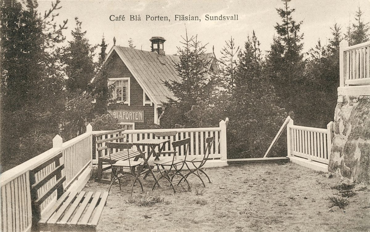 Nykterhetskaféet Blå Porten, beläget strax norr om Fläsians havsbad. Öppnades 1913 av ägarinnan Anna Ringblom. Revs på 1960-talet när E4 skulle breddas. Vykort.