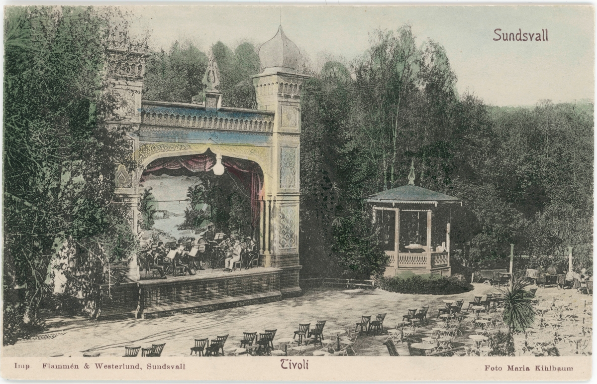 Musikpaviljongen vid sommarrestaurangen Tivoli. Kolorerat vykort. Tryckeri: Flammén & Westerlund, Sundsvall.