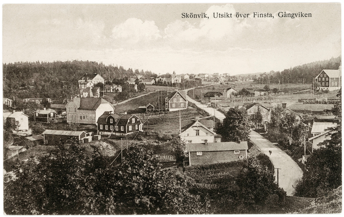 Vy över Skönvik, Finsta och Gångviken. Vykort.