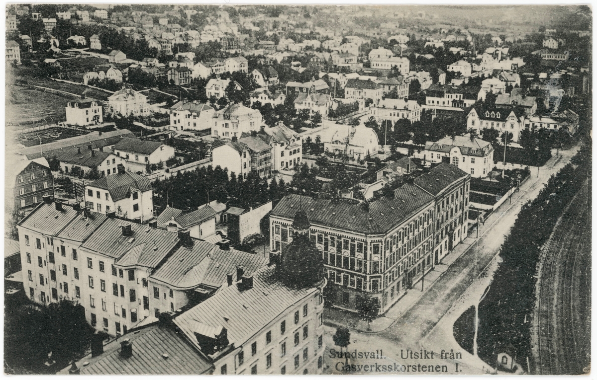 Vy över Södermalm med Södra Järnvägsgatan, de s k Stockholmshusen samt övrig bostadsbebyggelse. Text på vykort "Sundsvall. Utsikt från Gasverksskorstenen I".
