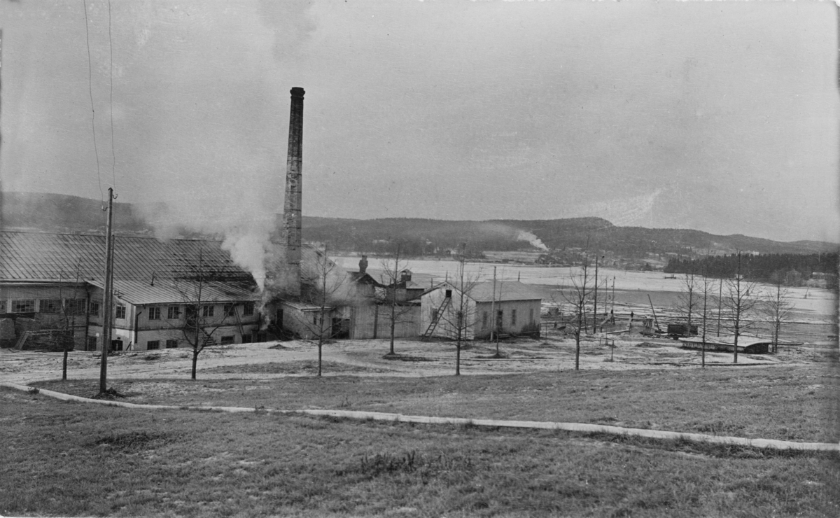 Tunadals sågverk. På andra sidan sundet ses Alnö. Vykort.
