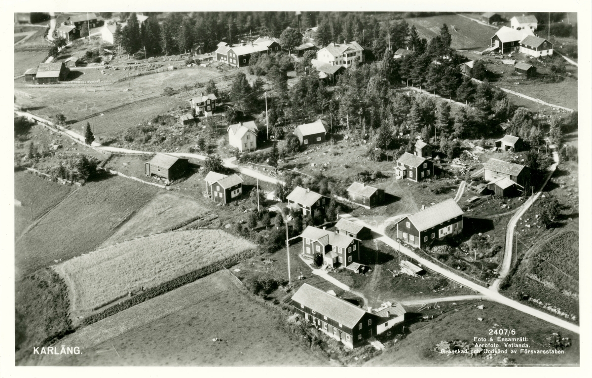 Flygbild över jordbrukslandskap i Karläng. Vykort.
