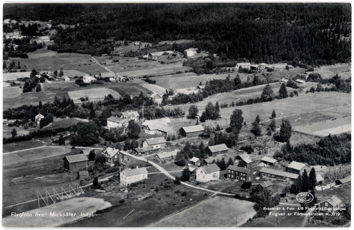 Flygbild över Micksäter, Indal. Vykort.