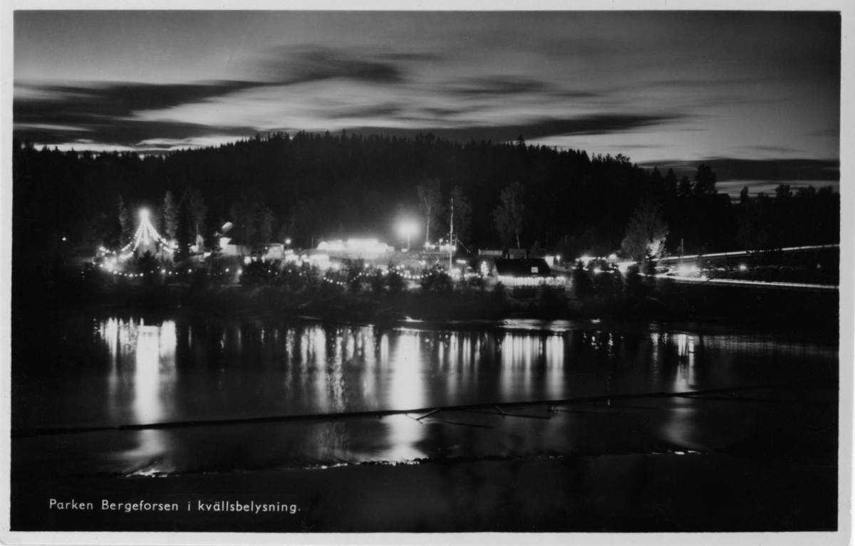 Bergeforsens folkets park i kvällsbelysning. Vykort.