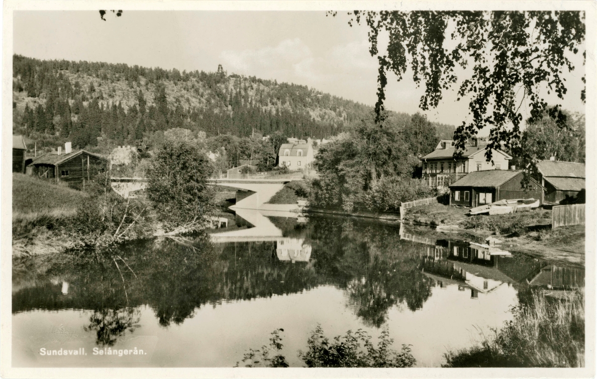 Vy norrut med Selångersån samt Västkilen till höger. Gammal bebyggelse med koppling till färgeri och bryggeriverksamhet. Widebron mitt i bild med uthus tillhörande Widegården till vänster.