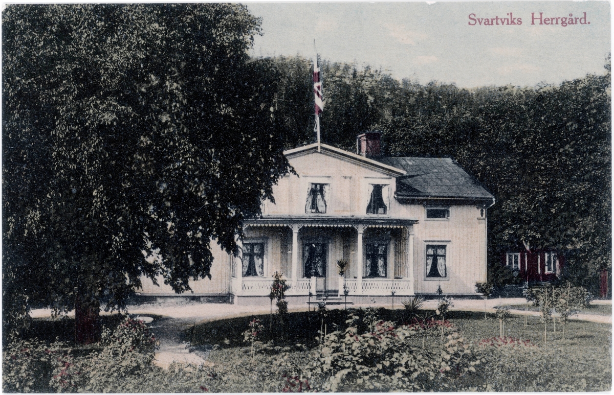 Svartviks herrgård från baksidan med berget i bakgrunden. Kolorerat vykort..