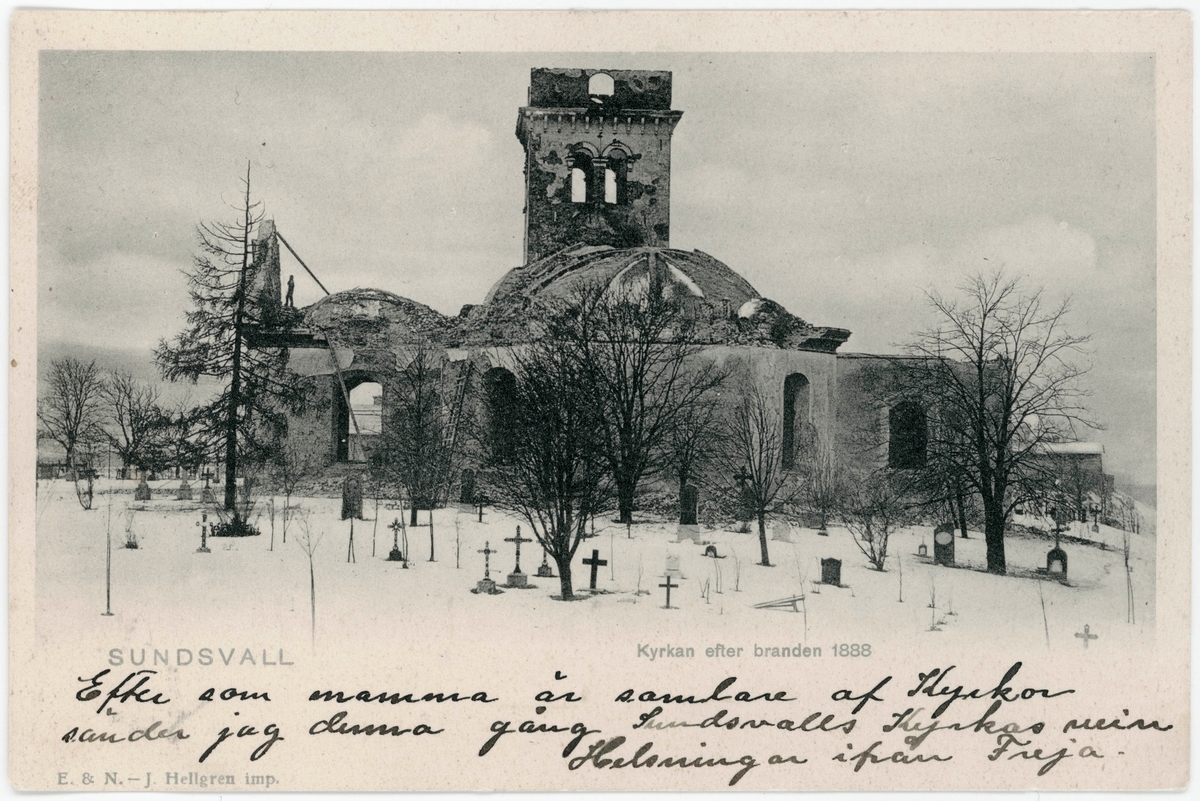 Den nedbrunna kyrkan Lovisa Ulrika från 1753 med kyrkogården i förgrunden. Brevkort.