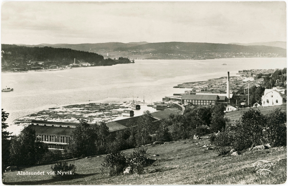 Alnösundet mot norr. Nyviks sågverk syns närmast i bild. Vykort.