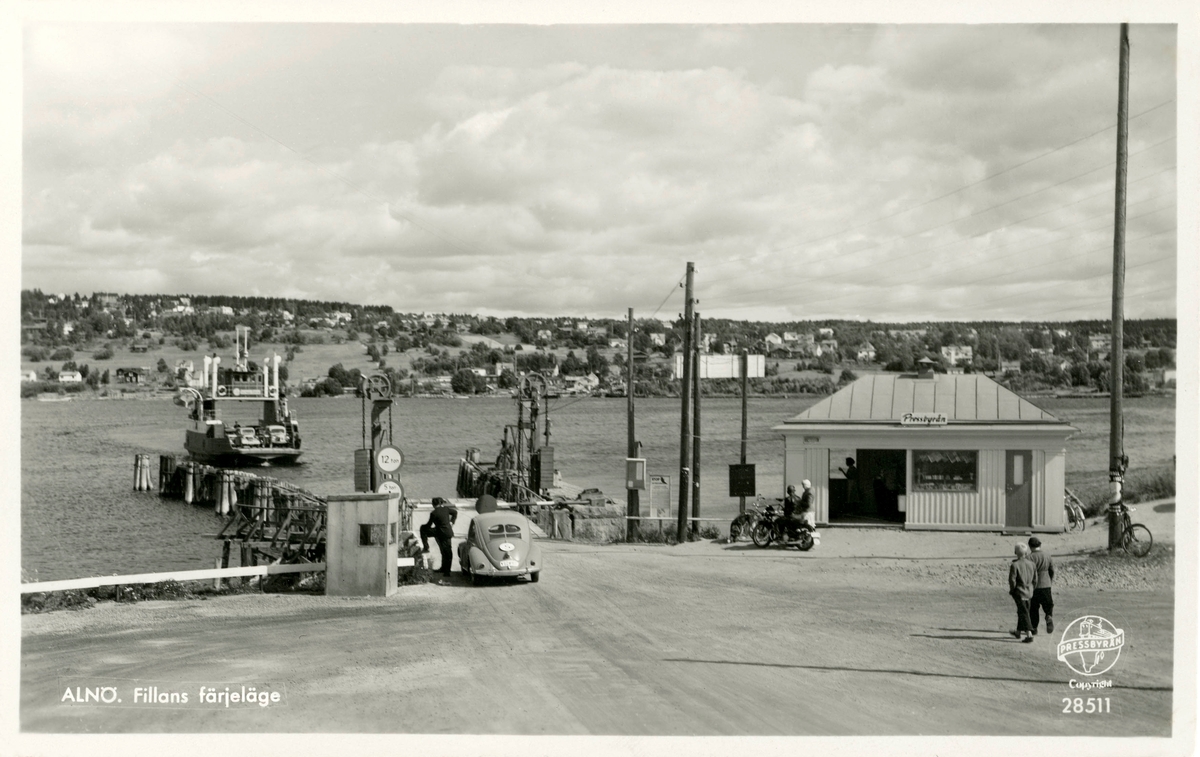 Fillans färjeläge med Alnö i bakgrunden. Färjan har just lämnat kajen. Vykort.