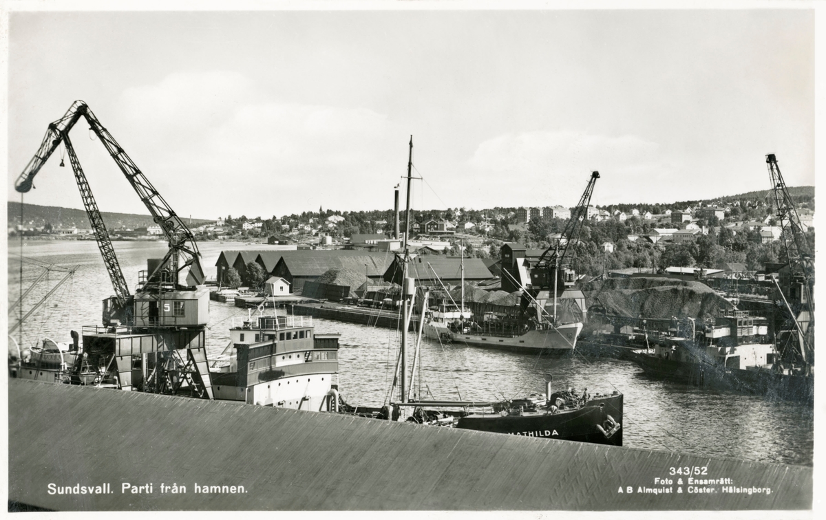 Vy över Järnvägsbassängen och massamagasinen vid Rosenborg. Kolhögar och lastande fartyg vid kajerna. Vykort.