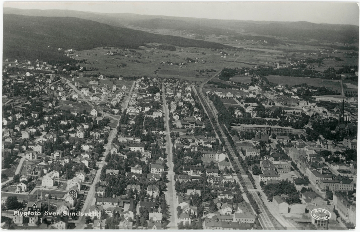 Flygbild över Sundsvall taget från öster. Mot det lantliga Nacksta löper från vänster Bergsgatan, därefter Långgatan och till höger järnvägen. Vykort.
