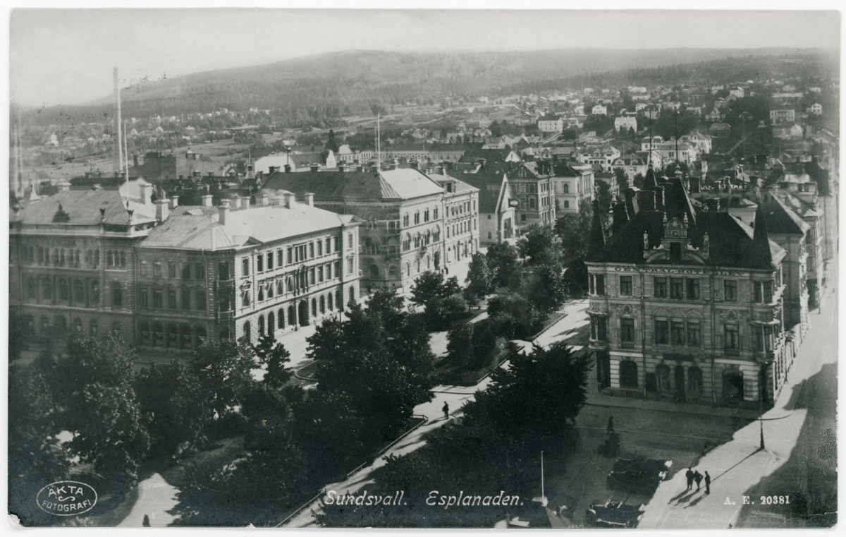 Motiv med Esplanaden sedd från norr, troligen taget från tornet i Granska huset. Från vänster ses Sundsvalls Enskilda Bankoch till höger ses Centralhotellet. Vykort.