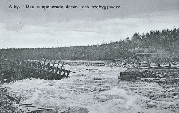 Den ramponerade damm-och brobyggnaden i Ljungan vid Alby. Vykortet daterat 1907-06-14.