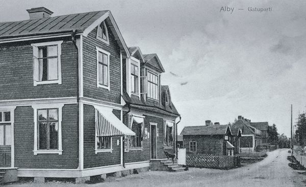 Gatuparti från Alby. Byggnaden närmast till vänster ägdes av Frans Tiderman som förutom Tidermans klädaffär även inrymde ortens postkontor. Vykort.