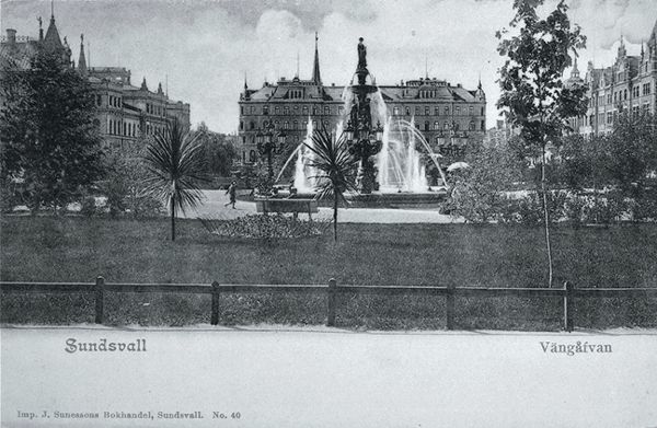Vykort/brevkort föreställnade Vängåvan med utsikt mot det Hirschska huset i kvarteret Nyttan, till vänster om detta Stadshuset och till höger det Granska huset i kvarteret Hälsan. Bildtext tryckt på vykort "Sundsvall Vängåfvan Imp. J. Sunessons Bokhandel, Sundsvall No. 40".