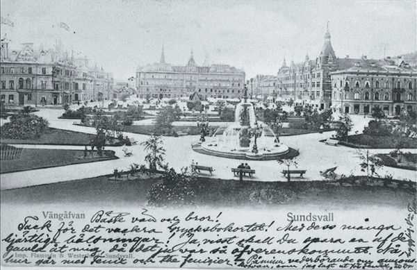 Vykort/brevkort med Vängåvan i förgrunden med vy mot Hirchska huset och Stora torget. Bildtext till vykort "Vängåfan Sundsvall Imp Flammèn & Westerlund. Sundsvall".