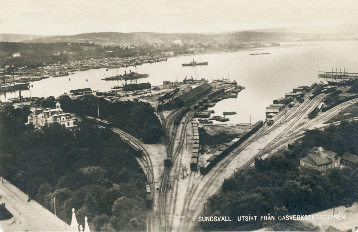 Vy över Sundsvallsfjärden, med på bilden bland annat gamla Järnvägsstationen, Järnvägsparken och Stadsmon. Text på vykort "Sundsvall. Utsikt från Gasverksskorstenen".