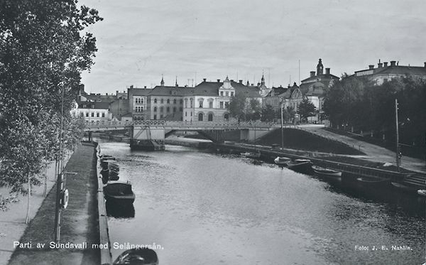 Selångersån med Storbron. Bildtext till vykort "Parti av Sundsvall med Selångersån."