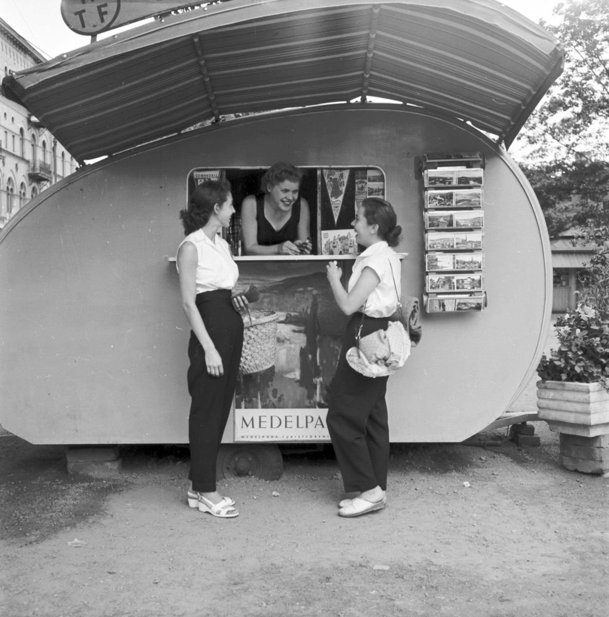 Husvagnsliknande turistbyrå med en leende turistguide och två besökare på Esplanaden i Sundsvall.