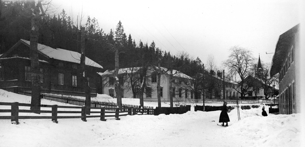 Parti av Svartvik. Från vänster ses bostadshus (Amanda och Helmer Edlund), brukskontoret, prästgården samt kyrkan längst bort efter gatan. Till höger skymtar handelsboden.