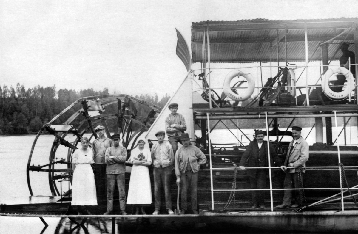 Besättningen på hjulångaren "Indalen" som trafikerade sträckan Bergeforsen-Indal. Båten byggdes 1887. 1928 gjordes båten om till flytande kafé för att därefter fungera som matservering vid bygget av Östrandsfabriken. 1934 skrotades båten.