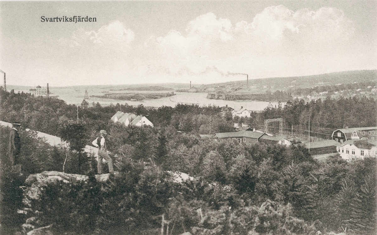 Vy från berg taget över Svartviksfjärden. Vykort.