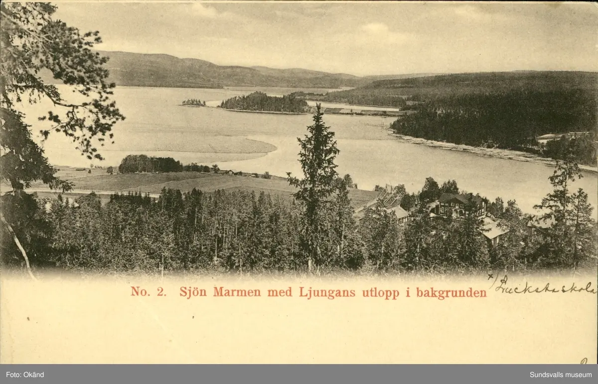 Vykort med motiv över sjön Marmen med Ljungans utlopp i bakgrunden.
