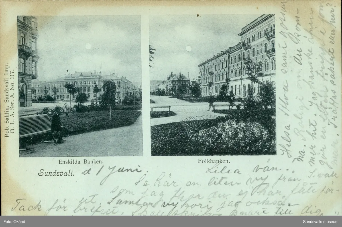 Vykort med motiv över Enskilda banken och Folkbanken i Sundsvall.