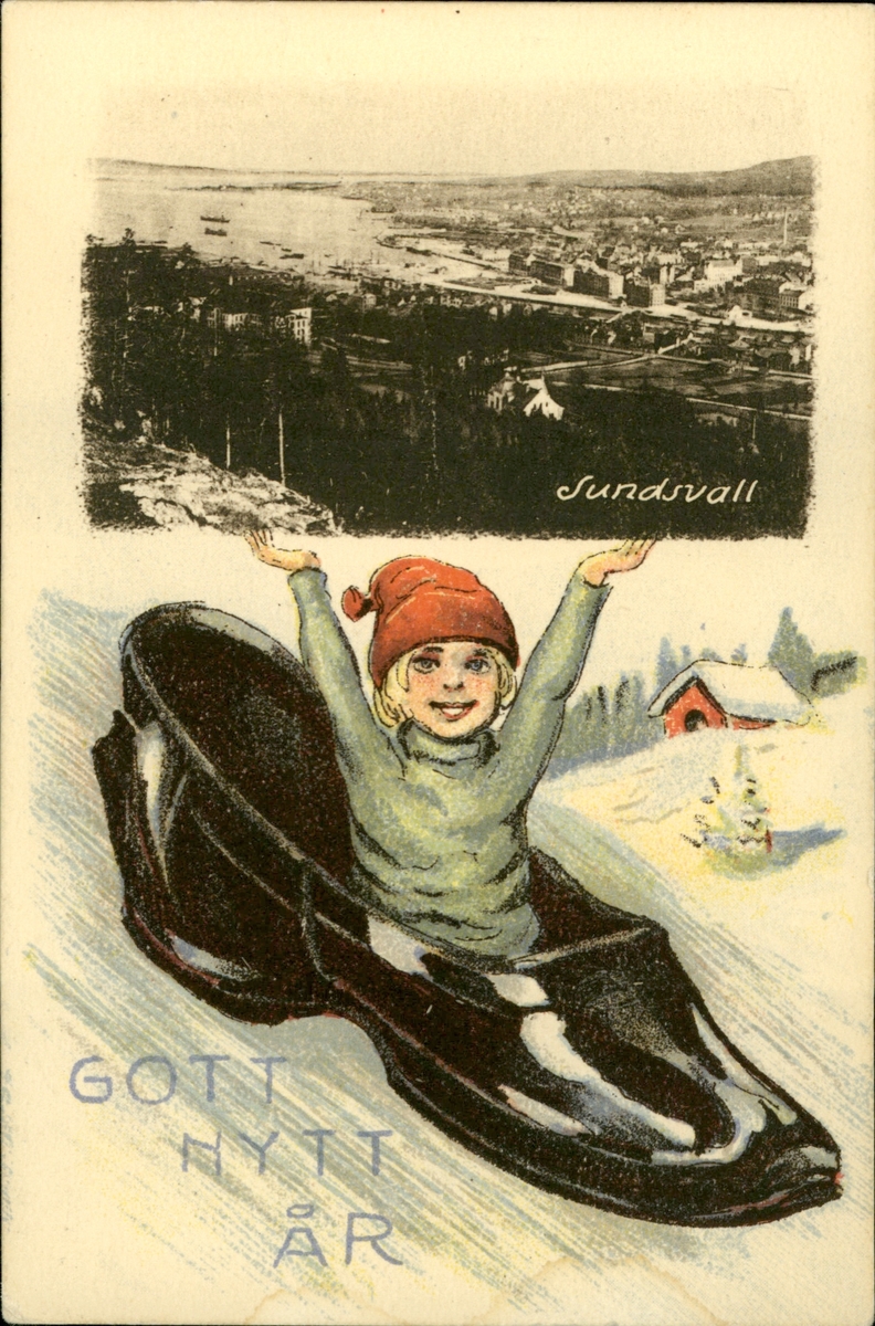 Vykort med motiv över en pojke i en sko med en infälld bild av hamnen i Sundsvall med texten: Gott Nytt År.
