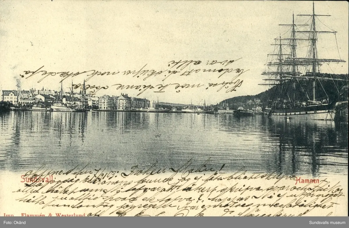 Vykort med motiv över hamnen i Sundsvall.
