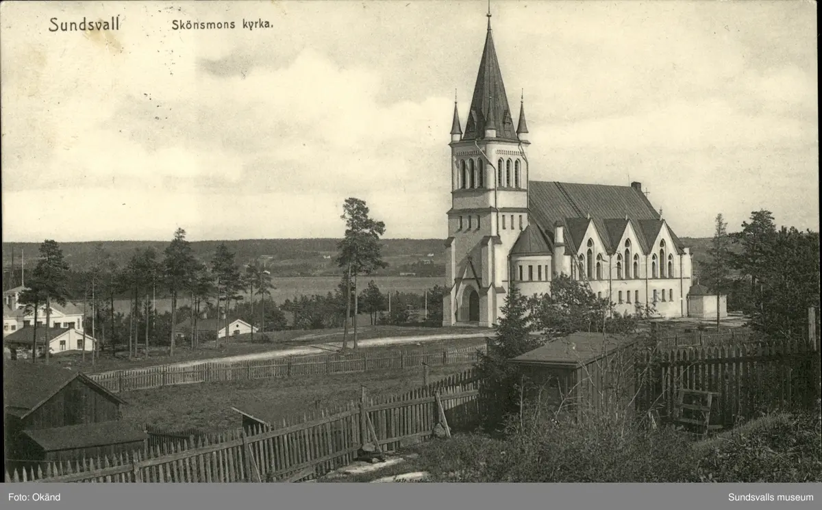 Vykort med motiv över Skönsmons kyrka och Kubikensborgs Herrgård i bakgrunden.