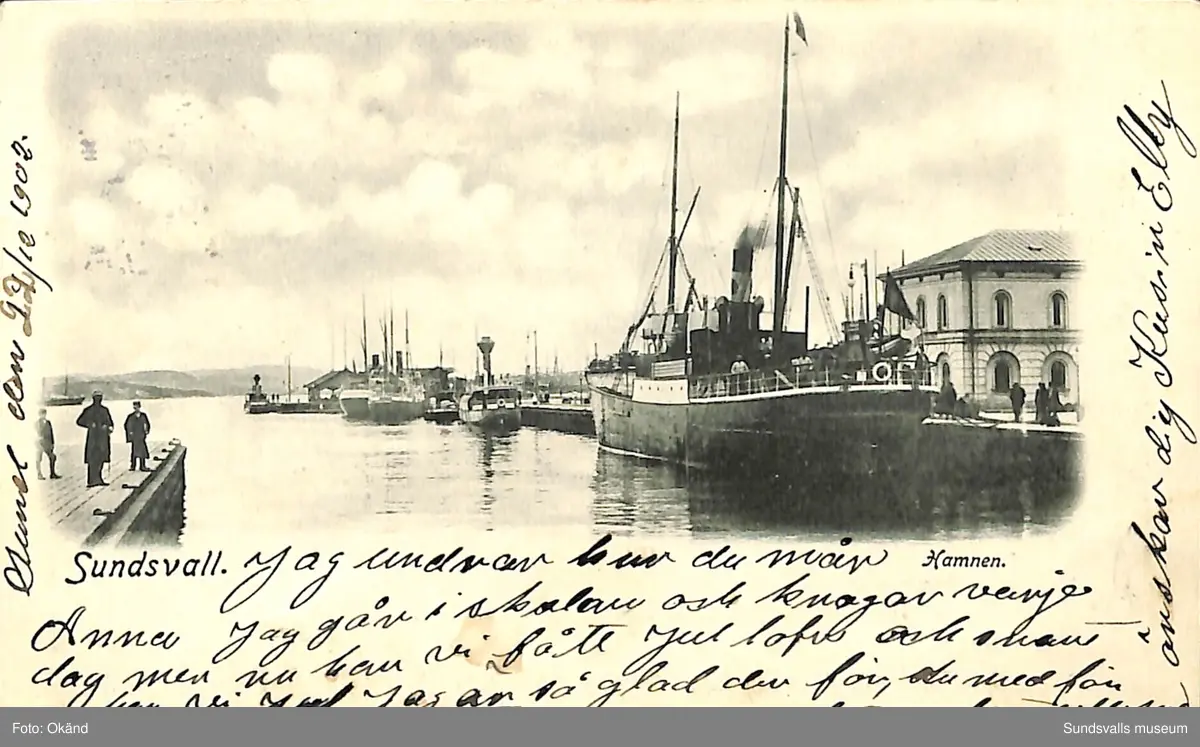 Vykort med motiv över passagerarbåtarna i hamnen i Sundsvall.