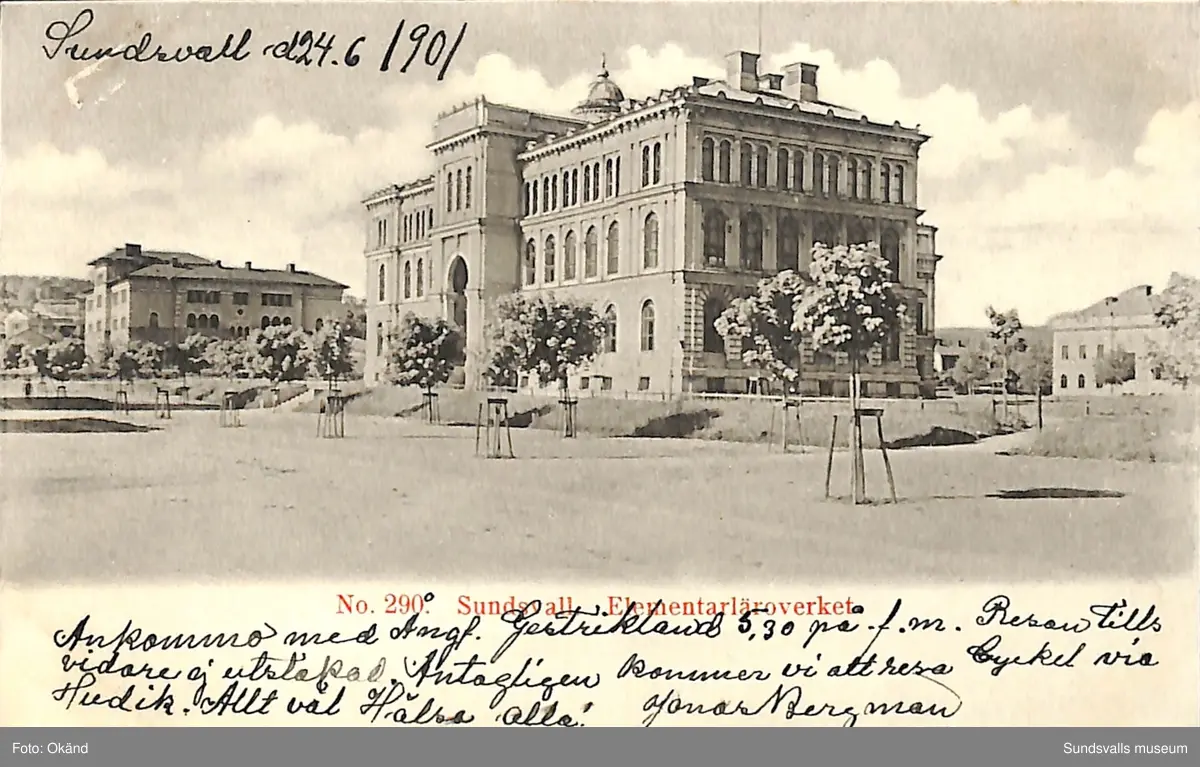 Vykort med motiv över Elementärläroverket i Sundsvall.