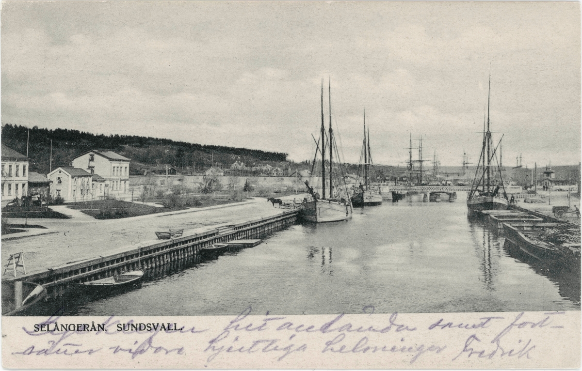 Selångersån. Till vänster Norrmalm med Skepparegatan samt den vridbara öppningsbara Tivolibron rakt fram. Kallbadhuset ses skymta längst till höger i bild. Segelfartyg samt vedpråmar efter kajerna. Brevkort daterat 1912 från avsändaren.