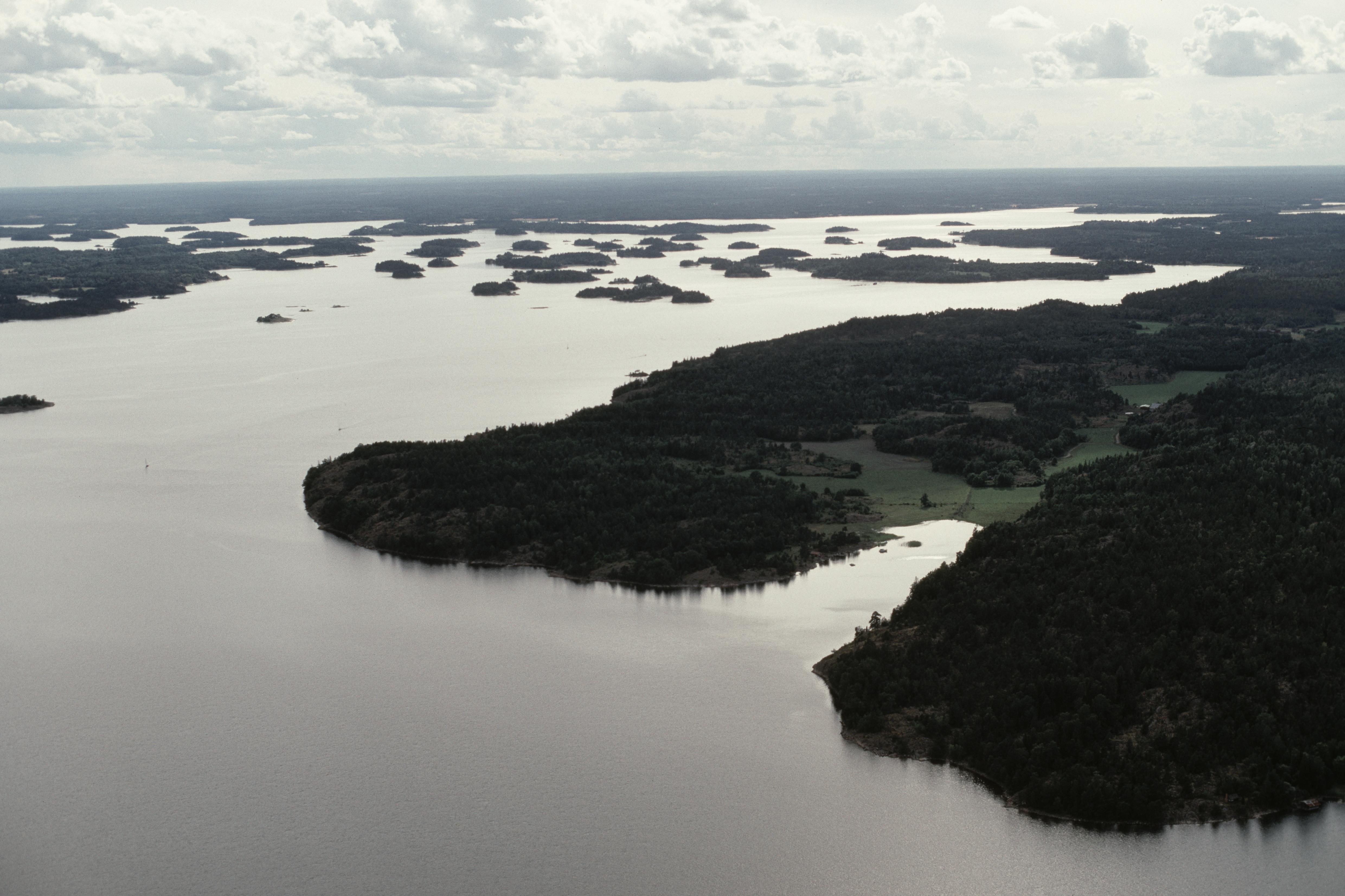 Korpetorps by vid gränsen mot socknet Sankt Anna i Lönshuvudfjärden. Vårdkase RAÄnr Rönö 1:1 på udden Lönshuvud vid bildens mitt. Vid Korpetorp boplatser Rönö 8:1, 33:1, 34:1, 35:1 m.fl. Bilden är tagen mot (väderstreck): SV