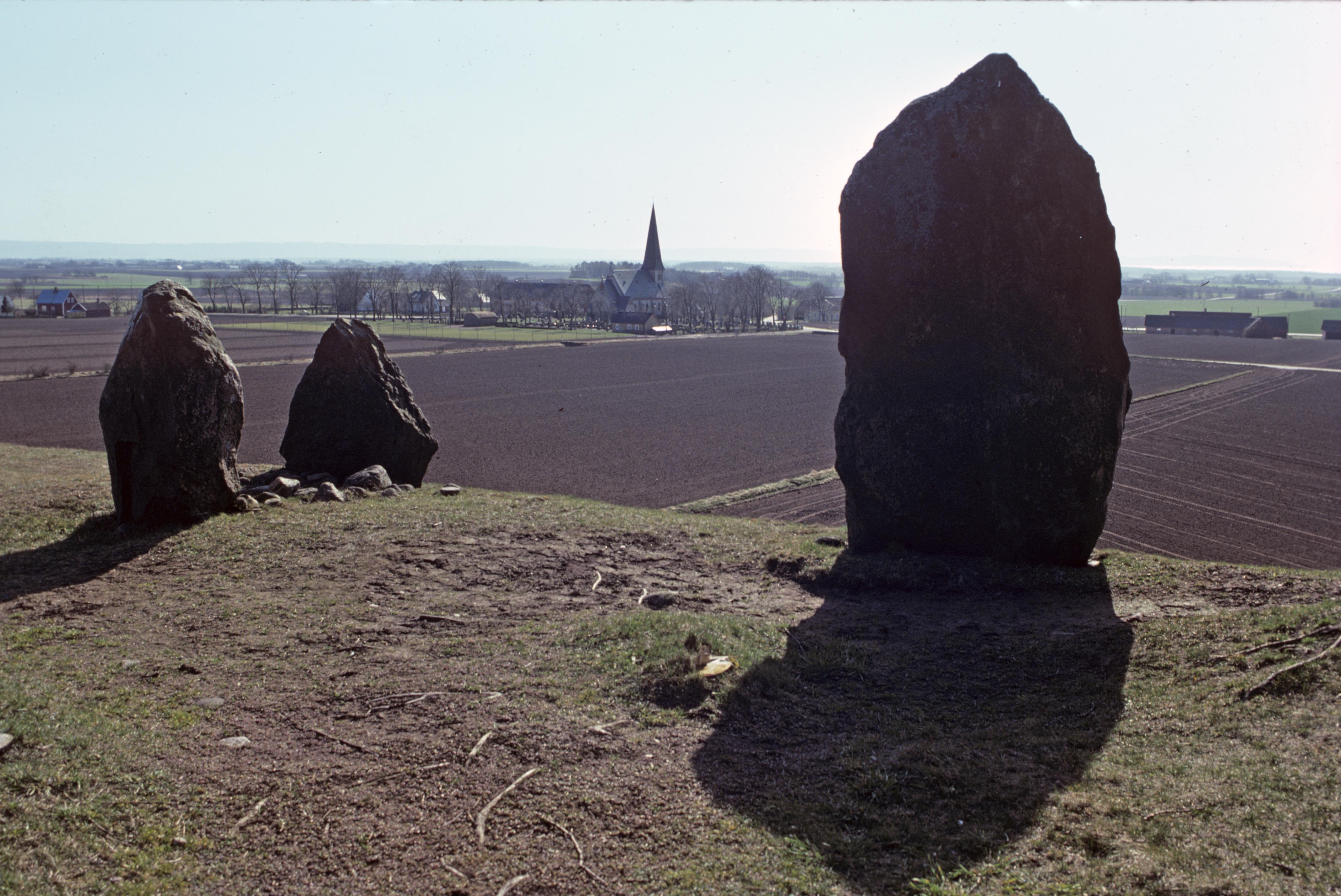 Gravfält, resta stenar, RAÄ-nummer Tjärby 37:1. I mitten av bilden syns Tjärby kyrka. Bilden troligen från mitten av 1970-talet.