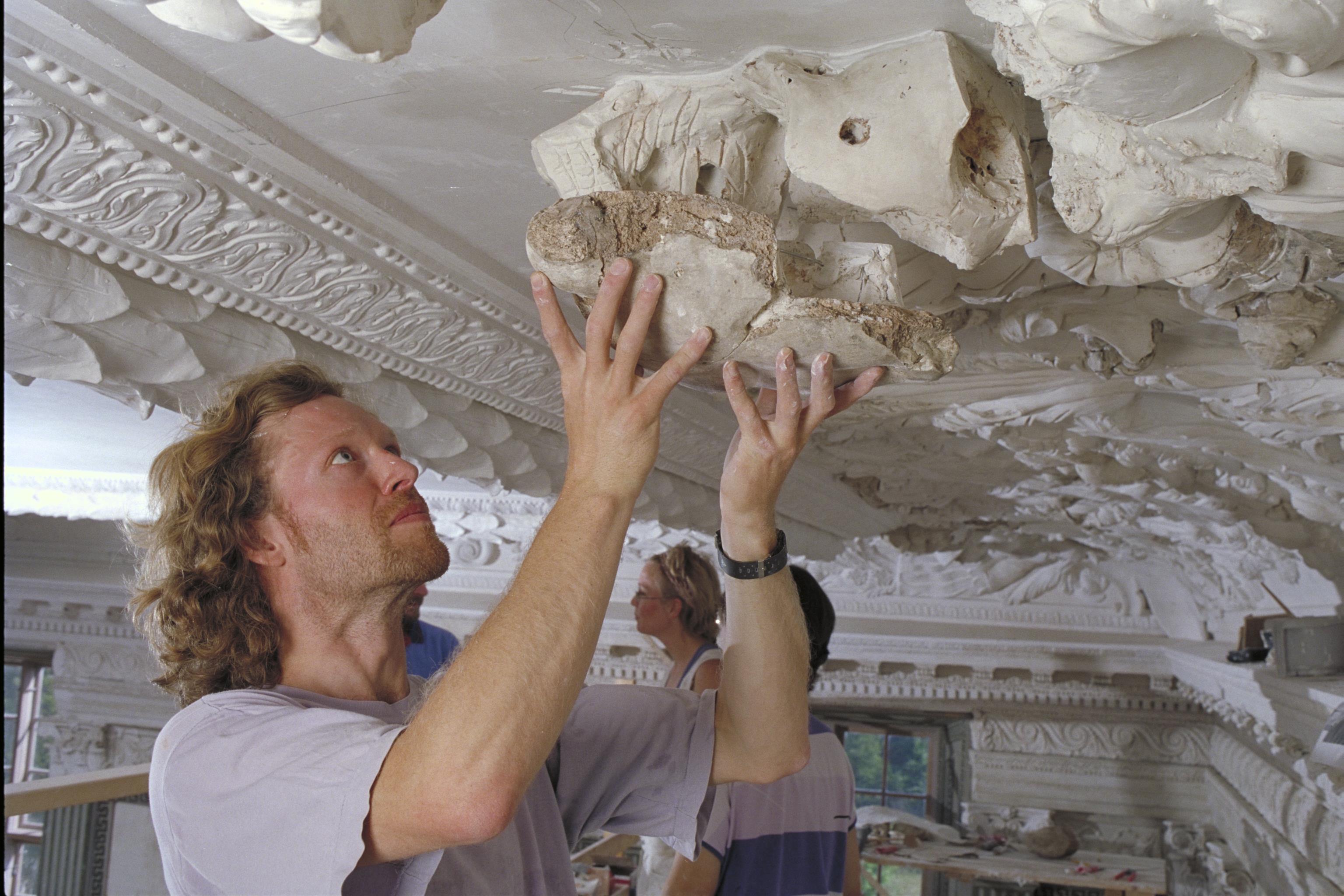 Beskrivning: Riddarsalen. Montering av stuckaturdetalj.