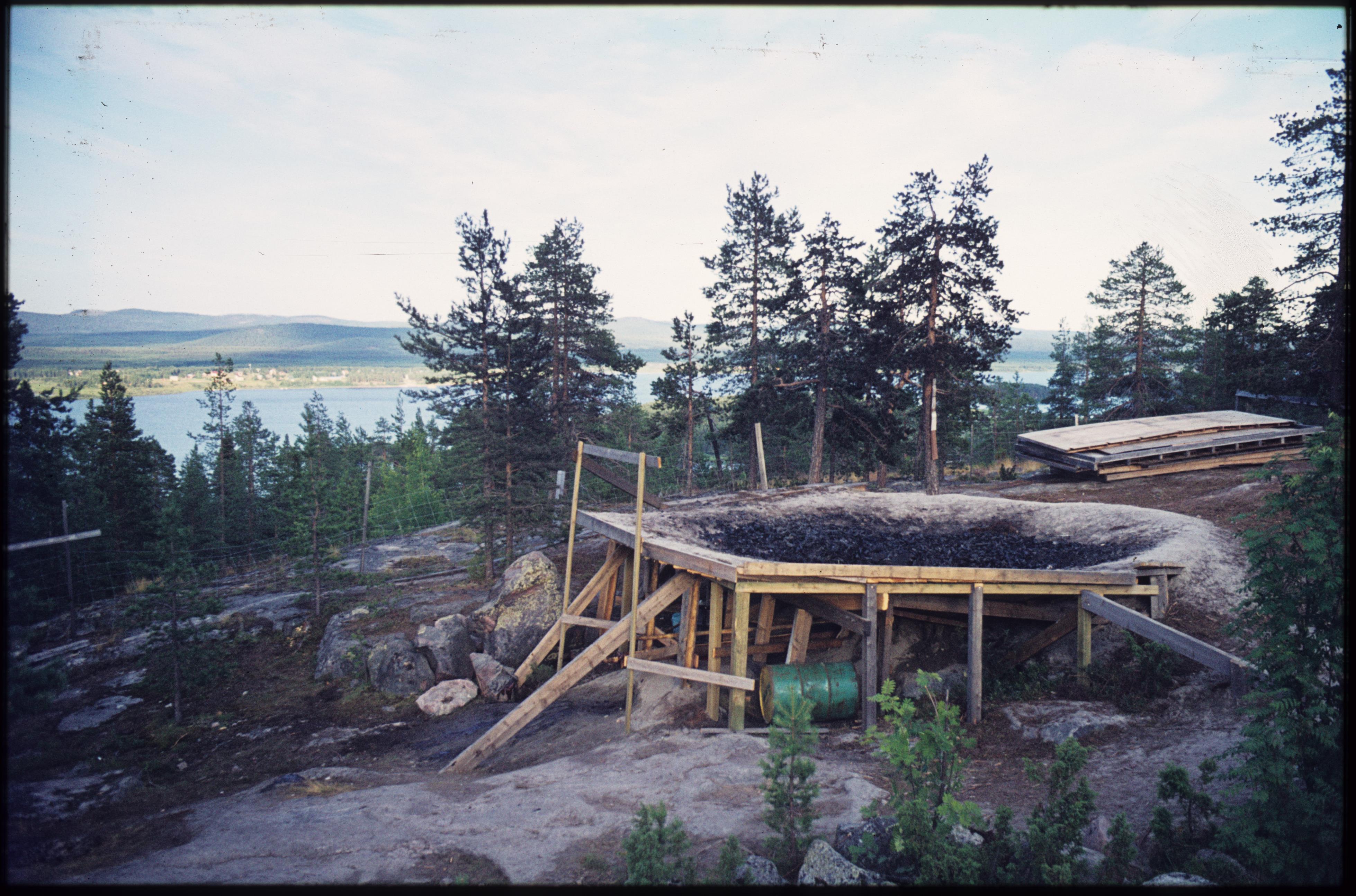 Rekonstruktion av tjärdal. Belägen invid uppfartsväg till utsiktsberg S om Överkalix.