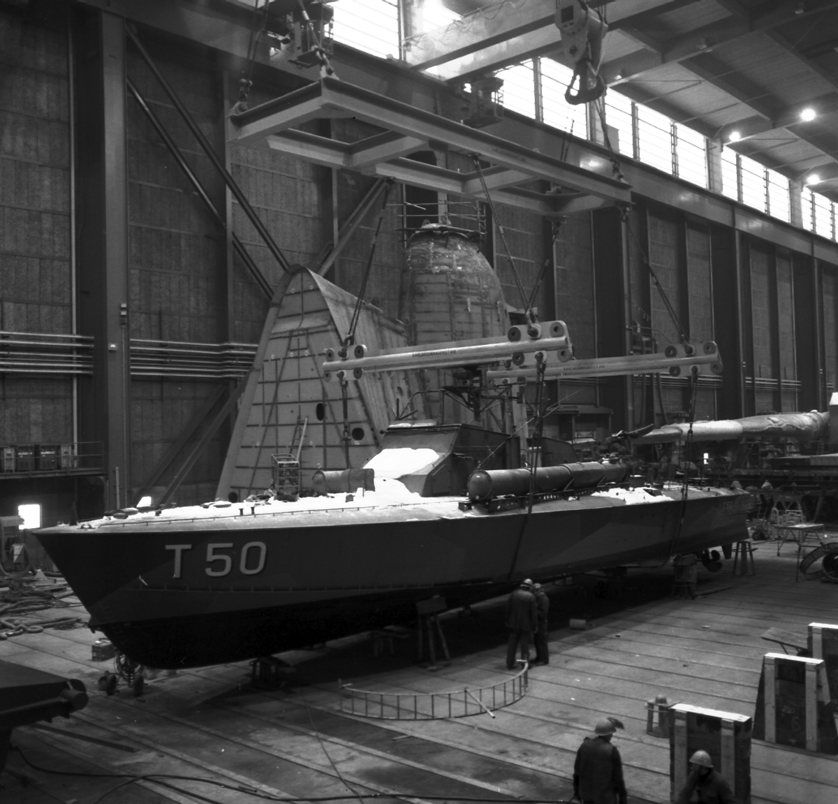 Lyft av torpedbåten T 50 i montagehallen