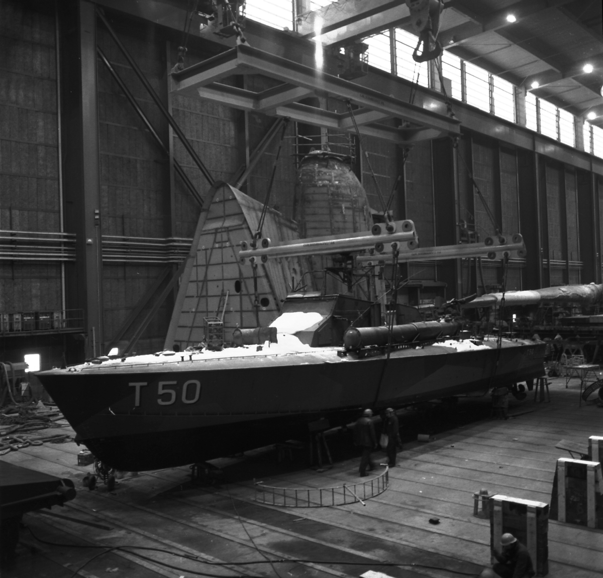 Lyft av torpedbåten T 50 i montagehallen